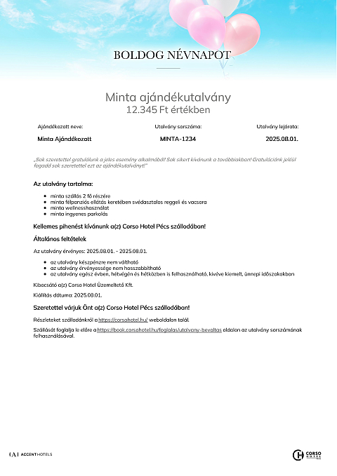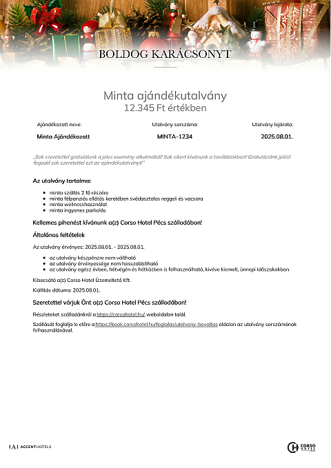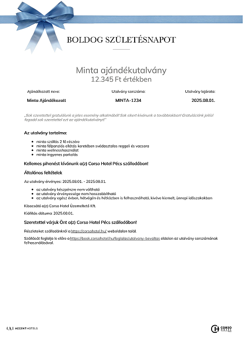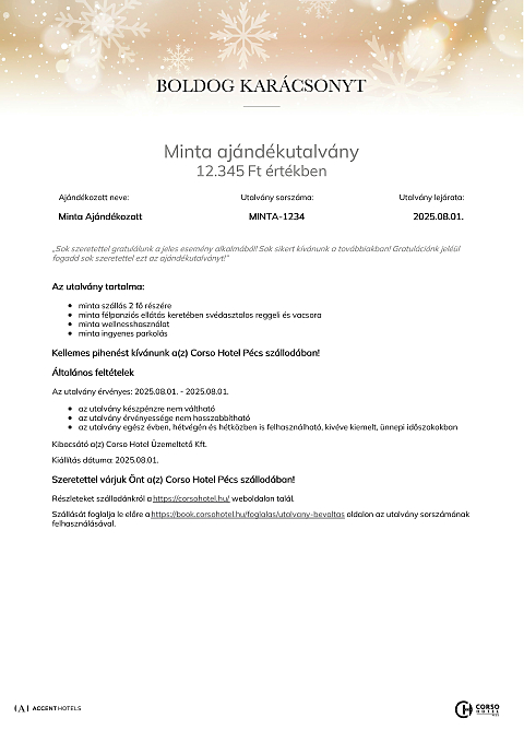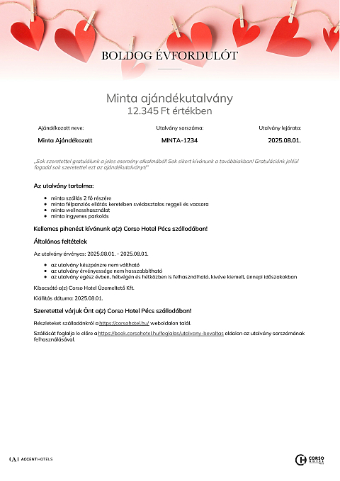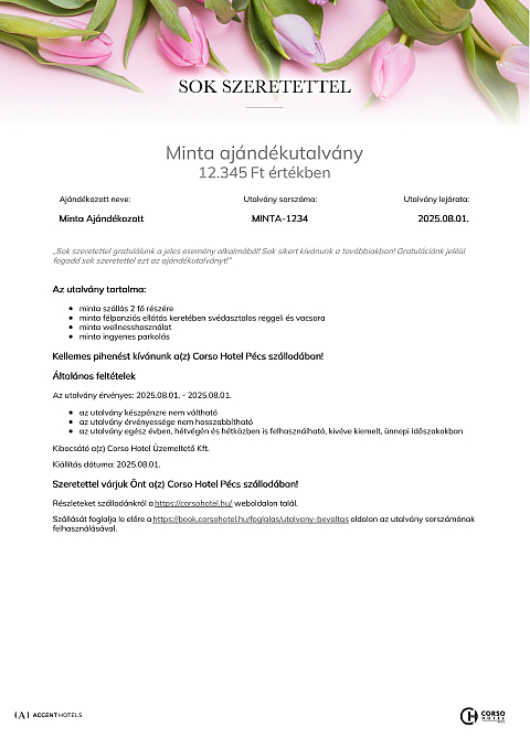 Az utalvány a(z) Corso Hotel Pécs szállodában váltható be minden olyan számla részben vagy egészében történő fizetésére, melyen legalább egy éjszaka szállás szolgáltatás is szerepel.